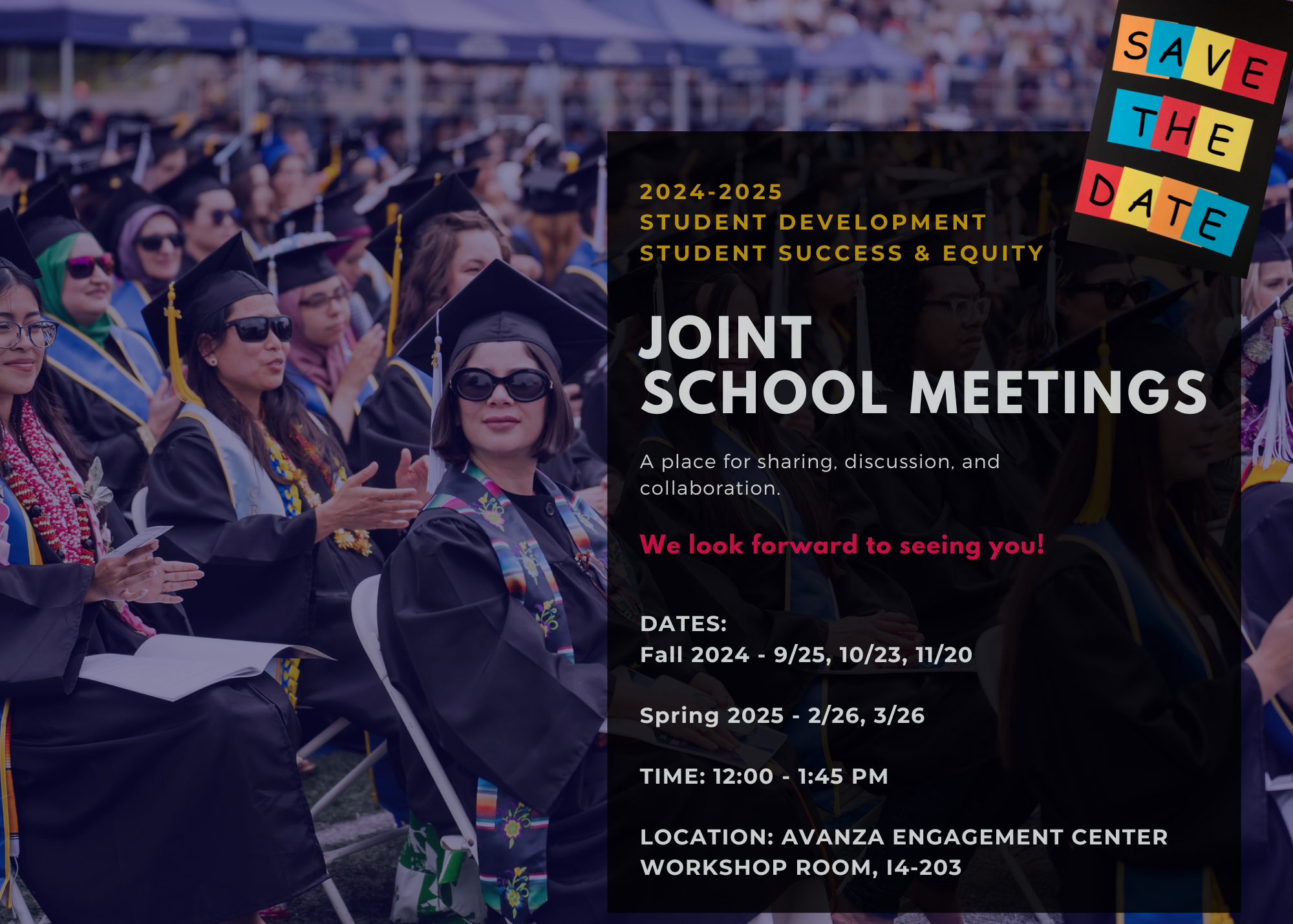 The Schools of Student Development and Student Success & Equity have regularly scheduled school meetings designed to support professional learning and development among all the departments that support these areas. These meetings provide an opportunity to engage in conversation about best practices, promote a culture of learning, while providing opportunities to engage in purposeful and meaningful ways.